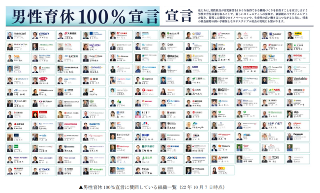 2019 年 3 月より、男性も子どもを育てるための育児休業が取得できる組織作りに向け、経営者がコミットを表 明する「男性育休100%宣言」の募集を開始したところ、2022 年 10 月 7 日時点で 153 社が賛同を表明していま す。「現在、自社内で男性の育児休業取得率 100%の実現を目指して取り組んでいる」という組織や「今後、取得 率をあげて、いずれは100%を目指したい」と考える組織の代表者などが宣言するとともに、各社で男性も育児 休業取得ができる環境整備のための勉強会などを開催しています。