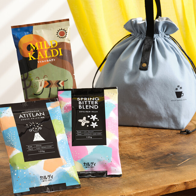 株式会社キャメル珈琲が運営するカルディコーヒーファームでは、人気No.1ブレンド「マイルドカルディ」と、春にピッタリなバッグ限定の2種のコーヒーを巾着バッグにセットした「春のコーヒーバッグ」を2023年4月1日(土)より発売します。