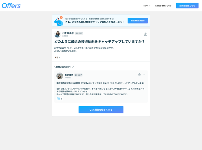 ※1参考:プレスリリース「あなたのキャリアの悩みを有識者/経験者に質問・回答できる!Offers「キャリア特化型Q&A機能」β版リリース https://prtimes.jp/main/html/rd/p/000000037.000053307.html