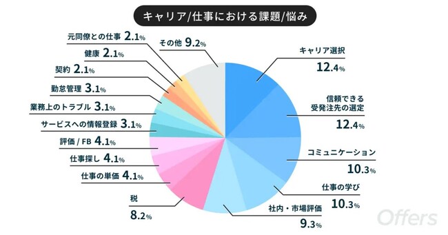 このような思想の基、「Offers」の利用ユーザーへ「キャリアや仕事における課題・悩み」に関するアンケートを実施したところ、「キャリア選択」と回答した方が12.4%と、キャリア形成に多くの方が悩まれていることが分かりました。