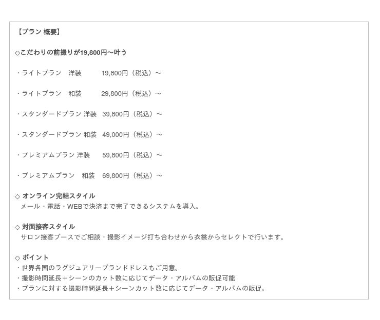 前撮りでは、世界各国のラグジュアリーブランドドレスもご用意、【衣裳・美容・撮影・写真のレタッチ】が19,800円(税込)~WEB・メール・電話で予約から決済まで行える【オンラインスタイル】サロン接客ブースでのご相談から衣裳セレクトまでを行う【対面接客スタイル】からお選びいただけます。(※撮影時間延長+シーンのカット数に応じてデータ・アルバムの販促可能)今後は、人生の節目の1シーンをプロデュースする写真の総合事業へ展開して参ります。