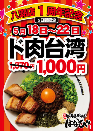 飲食店を中心に事業展開する株式会社ヴィア・ホールディングスの子会社である株式会社扇屋東日本(東京都新宿区、代表:中井 次郎)が運営する「麺屋はなび八潮店」が、おかげさまで、開店1周年を迎えました。この度、1周年を記念して、人気商品の「ド肉台湾まぜそば」を1,000円(税込)でご提供致します。「ド肉台湾」とは、存在感がたっぷりのド肉(食べ応え抜群なドデカチャーシュー肉)と、台湾ミンチ(唐辛子とニンニクを効かせた醤油味ピリ辛ミンチ)が、ゴロゴロっとたっぷり乗っている食べ応え十分のまぜそばです。