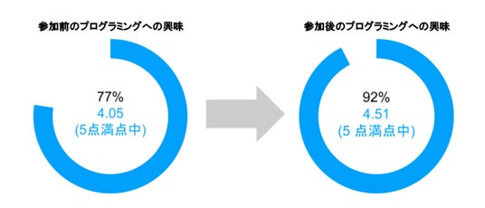 ・参加前にプログラミングへの興味関心がある人は77%。参加後は92%に向上。