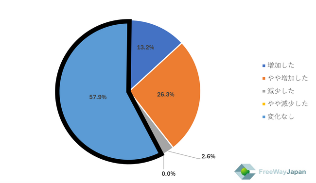 また、ボーナスが支給された、または支給予定で金額を把握している従業員の方に昨年の夏ボーナスと比べて増減はあったか聞いたところ、「変化なし」が最多で57.9%、「やや増加した」が26.3%、「増加した」が13.2%、「減少した」が2.6%、「やや減少した」が0.0%という結果だった。