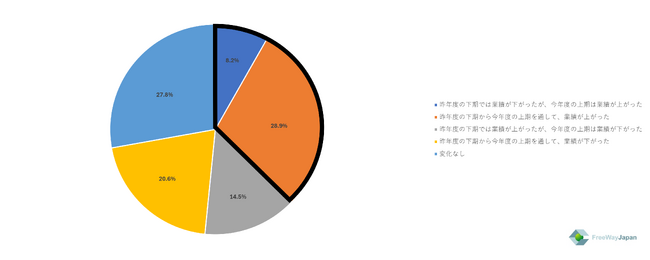 代表取締役の方に、今年度の上期と昨年度の下期で業績に変化はあったか聞いたところ、「昨年度の下期から今年度の上期を通して、業績が上がった」が28.9%、「変化なし」が27.8%、「昨年度の下期から今年度の上期を通して、業績が下がった」が20.6%、「昨年度の下期では業績が上がったが、今年度の上期は業績が下がった」が14.5%、「昨年度の下期では業績が下がったが、今年度の上期は業績が上がった」が8.2%という結果だった。