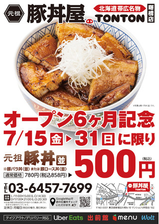 北海道・帯広豚丼が人気の「元祖豚丼屋TONTON 曙橋店」(住所:東京都新宿区片町6-10-102、TEL:03-6457-7699)では、オープン6ヶ月を記念して、7月15日(金)~31日(日)に限り「豚丼【並】」を期間限定価格500円(税込)で提供いたします。
