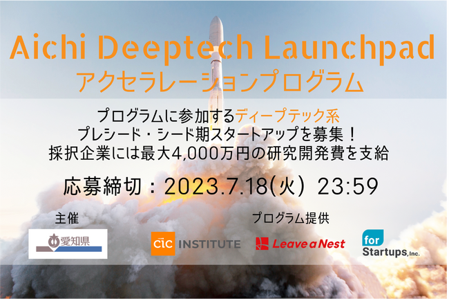 CIC Institute(本社:東京都港区虎ノ門、職務執行者: Timothy Rowe)は、株式会社リバネス(本社:東京都新宿区、代表者:丸幸弘)およびフォースタートアップス株式会社(本社:東京都港区、代表取締役社長:志水雄一郎)と共同で、愛知県(知事:大村 秀章)のディープテック推進事業「Aichi Deeptech Launchpad」を開始します。またこの度、本事業の一環として実施するアクセラレーションプログラムに参加するスタートアップの募集を開始いたします。対象はプレシード・シード期のディープテック系スタートアップとなっており、総合的な成長サポート(メンタリング、マッチング、経営スキル研修等)を提供します。それに加え、一部採択企業には1社あたり最大4,000万円の研究開発経費を支給するなど、ディープテック系スタートアップの成長を支援します。