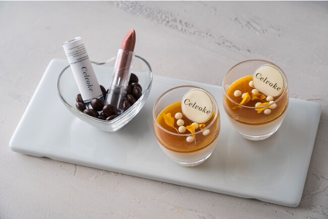ほのかな甘みと酸味が特徴のローズヒップゼリーをチョコレートのムースで包み込み、表面を艶やかにコーティングした「ビターチョコレートムース 」は、シンプルで上品な味わいが特徴的です。また、「トンカ豆のパンナコッタ」は芳香性の高いトンカ豆をふんだんに使用する事で上質な香りを纏ったパンナコッタに、Celvokeを象徴するテラコッタカラーをイメージした柿のクーリソースを添え、Celvokeのブランドロゴのチョコレートをあしらいました。「クランベリー・リップスティック」はCelvokeの深みのある発色のリップを再現した一品。ストロベ
