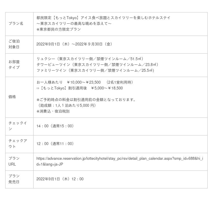 ご宿泊期間: 9月1日(木)~9月30日(金)(10月1日チェックアウトまで)の都民限定プラン
