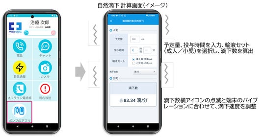 輸液ポンプやシリンジポンプの流量計算や、自然滴下の流量計算・速度調整を支援するアプリ。自然滴下では、滴下速度をアイコンの点滅や端末の振動で看護師へガイドする機能が特徴。