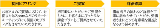 またすべての講座は、お客さまのご要望に応じて、カリキュラムや所要時間など自由なカスタマイズが可能です。またA・B・Cの各講座カリキュラムをミックスさせた複合講座も承ります。ぜひお気軽にお問い合わせください。