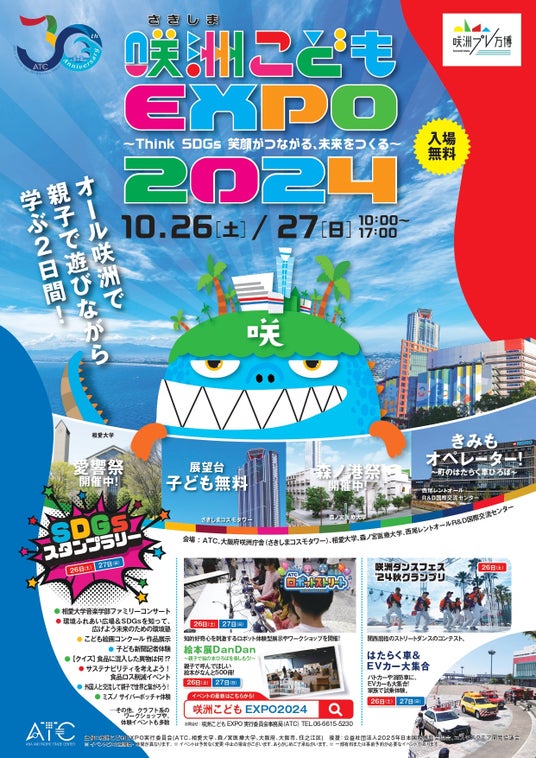 ATC(アジア太平洋トレードセンター株式会社)は、10月26日(土)と27日(日)の2日間、地域の学校、企業、行政と共に「第12回咲洲こどもEXPO2024 ~Think SDGs 笑顔がつながる、未来をつくる~」(※1)を開催します。本イベントは、咲洲の自然環境や文化、教育施設を活用し、子どもたちの創造力を伸ばし、未来へのチャレンジを応援することを目的とした体験型イベントです。