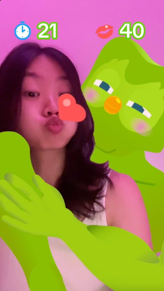ARフィルター「デュオ恋」は、30秒間の制限時間内で何回デュオとキスを成功させられるかを競うゲームです。