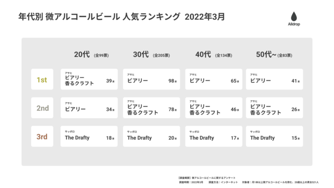 20代, 30代, 40代, 50代以上という年代別では、30代以上は1位にビアリー、2位にビアリー 香るクラフト、3位にサッポロ The DRAFTYという結果になりました。