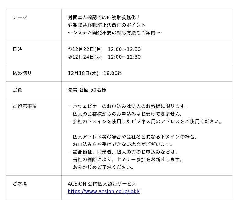 12月5日にパブリック・コメントにて「犯罪による収益の移転防止に関する法律施行規則の一部を改正する命令案」が公示されました。2025年2月に出された犯収法改正案にて非対面取引における本人確認のIC読取義務化については既に告知されておりましたが、今回対面取引における本人確認についてもIC読取を義務化する内容が告知されました。