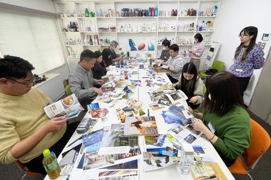 壁画を制作するにあたり、「大商硝子らしさとは何か」、「社外へどのような価値を伝えたいか」を探るため、社歴・所属部署・勤務地など多様な社員の方々に参加いただき、ワークショップを3回に分けて実施。視覚的な情報が大部分を占める壁画の特性に合わせて、ワークショップのプログラムを設計・運営しました。言葉による議論だけでなく、コラージュの技法を用いた色や形の抽出、絵を描くことを通したモチーフや構図などのアイデア発散、壁画事例から表現要素を絞り込むワークなどを盛り込むことで、共有しにくい感性面からの検討を重視した内容としました。