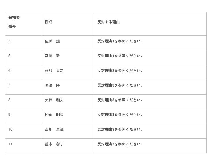 当社らといたしましては、以下の会社提案の候補者の方々については、下記に記載の理由から反対の議決権行使をお願いするものです。