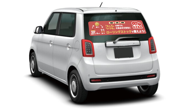 本キャンペーンは防災意識向上への取組みの一環として、防災の日(9月1日)をきっかけにご家庭での常備食品を見直す「ローリングストック」活動の啓蒙に協力していただける一般ドライバー100名を募集します。ドライバーは自家用車のリアウィンドウに「ローリングストック」啓蒙ステッカー(上図)を貼り、いつものように運転することで認知を広めます。走行特典として、走行距離500kmを達成した方には、常備食品として使える丸大食品商品詰め合わせ(5,000円分)をプレゼントします。