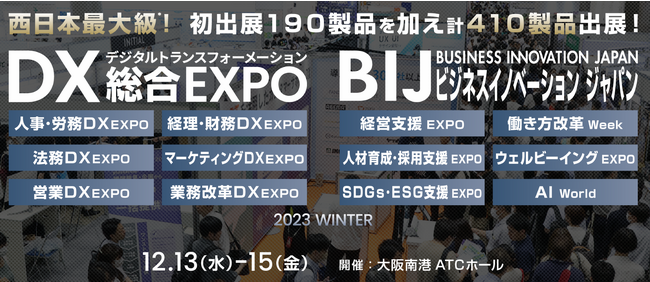 いよいよ来週12/13(水)から大阪南港ATCホールにて西日本最大級*DX総合展 『DX 総合EXPO 2023【冬】』『ビジネスイノベーションJapan 2023【冬】』が開催となります。業界トップによるDX・働き方改革・経営課題 解決のためのセミナーが多数開催されるほか、計410*の最新DXソリューションが出展いたします。来場登録により、ウェビナー無料視聴、セミナー無料申込、出展製品資料ダウンロードなど様々な特典がございますので、ご登録の上、ぜひご来場ください。