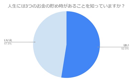 はじめに、「人生には3つのお金の貯め時があることを知っていますか?」とお聞きしたところ、「はい」と答えた方は52.5%、「いいえ」と答えた方は47.5%と、ほぼ同程度の結果となりました。