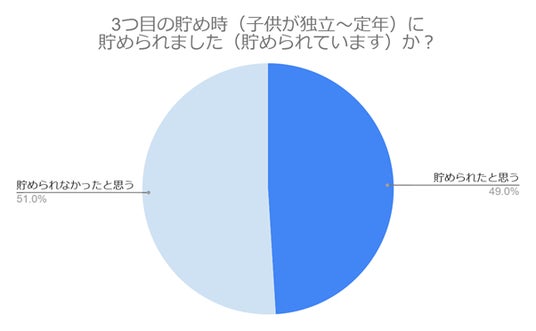 「3つ目の貯め時(子供が独立~定年)に貯められました(貯められています)か?」というアンケートでは、「貯められたと思う」と答えた方は49%、「貯められなかったと思う」と答えた方は51%と、ほぼ同数の回答が得られました。