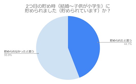 続いて、「2つ目の貯め時(結婚~子供が小学生)に貯められましたか?」とお聞きしたところ、「貯められたと思う」と答えた方は44.1%、「貯められなかったと思う」と答えた方は55.9%と、貯められなかったと思う方が過半数を超える結果となりました。