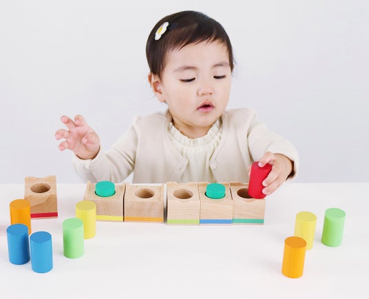 低年齢から、ピースをつかんでキューブの穴をねらって落とすなどのベーシックなポットン落としが楽しめます。落とす動作を繰り返すことで手指の発達を促進し、集中力を育み、キューブやピースの色を合わせて遊ぶことで、色の弁別・認識にもつながります。