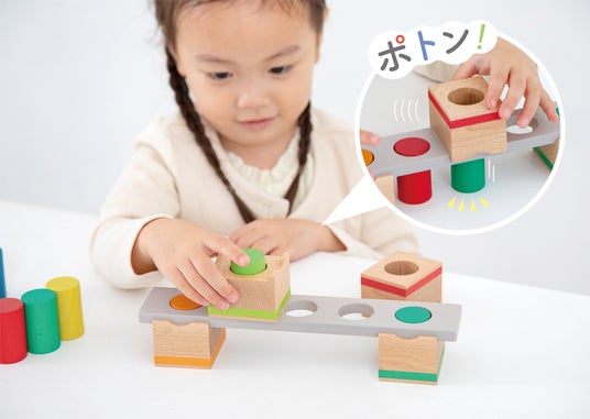 気持ちよさに思わずハマる!あそびのプロが監修したオリジナルの形状で「ポトン!」と落とす楽しさが味わえる、新感覚の知育玩具です。