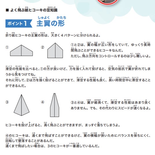 紙飛行機を遠くに飛ばすためののHOWTO本も付属しており、主翼の形、重心の位置、調整と飛ばし方など、紙飛行機を遠くに飛ばすためのヒントを得ることができます。