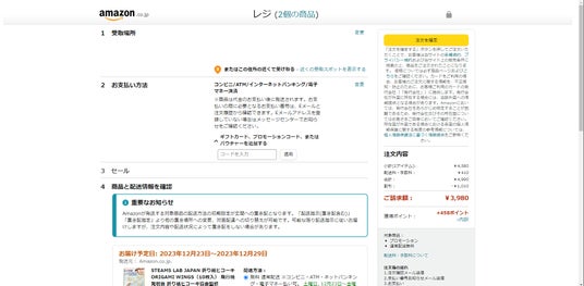 3.注文確定画面で受取場所、お支払方法の設定などを確認し「注文を確定する」をクリック