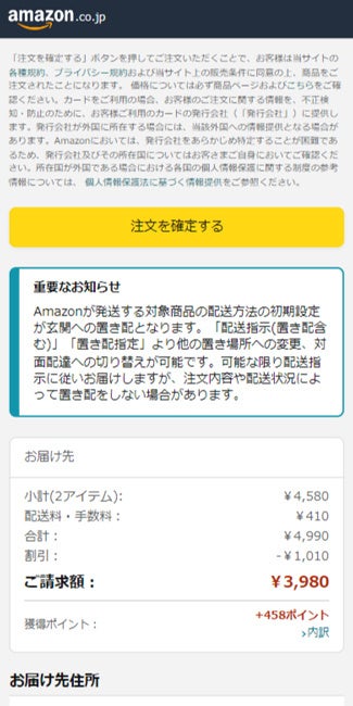 4.注文確定画面でお届け先の設定などを確認し、「注文を確定する」をクリック