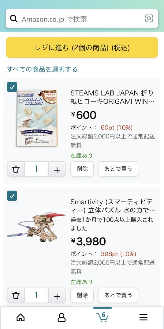 3.両商品がカートに入っていることを確認し「レジに進む(2個の商品) (税込)」をクリック