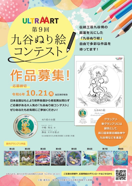 石川県能美市が誇る伝統工芸「九谷焼」の魅力を世界中に知ってもらうために始まった「九谷ぬり絵コンテスト」。今年で開催9回目を迎える当コンテストの作品を募集いたします。