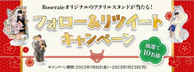 Roseraie公式Twitter(https://twitter.com/Roseraie_books)をフォロー&固定の投稿をRTしていただいた方の中から抽選で10名様にアクリルスタンドをプレゼントいたします!