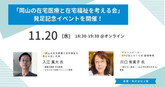 株式会社土屋の後援により、岡山の在宅医療・福祉の連携促進を目指す新団体「岡山の在宅医療と在宅福祉を考える会」(代表:入江真大医師)が2024年11月に設立されました。設立を記念し、11月20日(水)にオンラインでキックオフイベントを開催します。当日は、入江真大先生による設立経緯の説明に加え、ALS患者の在宅ケアに詳しい川口有美子氏による特別講演を予定しています。