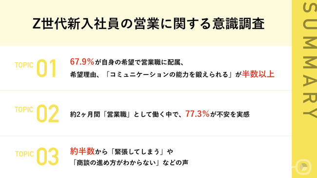 新卒で入社して営業職に配属されたZ世代の多くが、「緊張してしまう」や「商談の進め方がわからない」などから、「営業職」として働く上での不安を抱えており、実際に働いてみて、「断られることが多く、心が折れることが多い」や「大変だが、やりがいも感じている」など、不安を感じている一方前向きな姿勢も感じられる結果となりました。