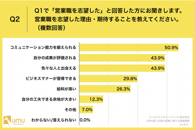 Q1で「営業職を志望した」と回答した方にお聞きします。「Q2.営業職を志望した理由・期待することを教えてください。(複数回答)」(n=57)と質問したところ、「コミュニケーション能力を鍛えられる」が50.9%、「自分の成果が評価される」が43.9%、「色々な人と出会える」が43.9%という回答となりました。