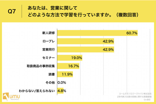 「Q7.あなたは、営業に関してどのような方法で学習を行っていますか。(複数回答)」(n=84)と質問したところ、「新人研修」が60.7%、「ロープレ」が42.9%、「営業同行」が42.9%という回答となりました。