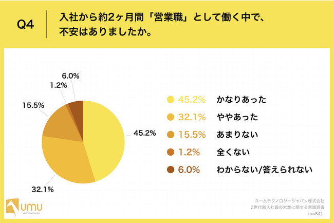 「Q4.入社から約2ヶ月間「営業職」として働く中で、不安はありましたか。」(n=84)と質問したところ、「かなりあった」が45.2%、「ややあった」が32.1%という回答となりました。