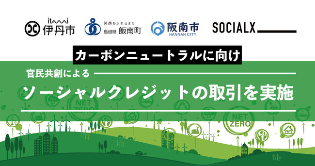 株式会社ソーシャル・エックス(東京都渋谷区、以下、当社)は、2050年カーボンニュートラルの実現に向けたモデルケースの創出を目的に、「都市自治体 伊丹市」「森林自治体 飯南町」「海洋自治体 阪南市」と4者で「脱炭素社会実現に向けた地域循環共生に関する連携協定」を締結しています。その取組の一環として、この度、当社が自治体間でのソーシャルクレジット取引を実施し、伊丹市庁舎のカーボンニュートラルを実現したことをお知らせします。