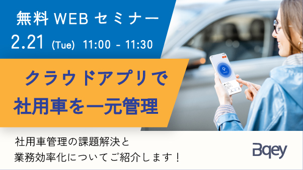 株式会社東海理化は、社用車管理の課題を解決するDXサービス「Bqey(ビーキー)」のウェビナーを開催します。社用車の管理を効率化できる本システムの特長やアルコールチェック連携機能についてご紹介します。