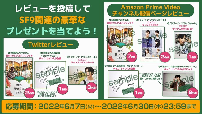 SF9の日本デビュー5周年を記念し、Amazon Prime Videoチャンネル「韓国ドラマ&エンタメ Channel K」では、現在好評配信中のSF9出演作の紹介やインタビュー、さらにはSF9メンバーの直筆サイン入りグッズが当たるプレゼントキャンペーンを実施中!