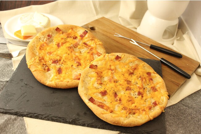 ライ麦全粒粉入りフランスパン生地を薄く伸ばし、オニオンサラダとベーコン、チェダーチーズをのせ、パリパリに焼き上げました。パリッと生地にシャキッとオニオンの爽やかさが軽い食べ心地。ほどよい酸味とコクのあるチェダーチーズをブラックペッパーで引き締めて、おつまみにも最適な一品に。