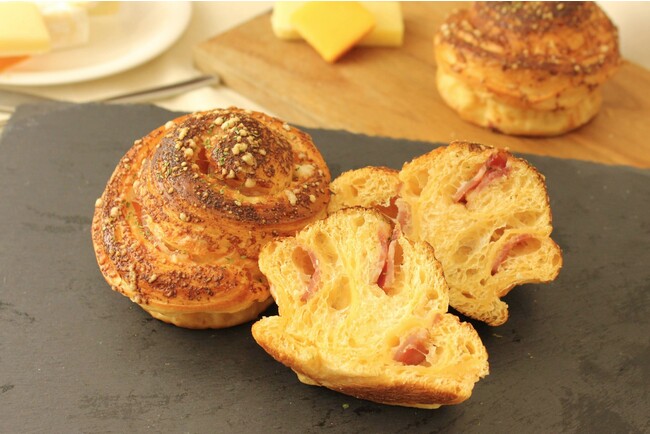 3種のチーズ(クリーム、チェダー、カマンベール)を使用したチーズ風味のデニッシュ生地に、ベーコンを巻き込み、仕上げにパルメザンチーズをかけて焼き上げました。手に取った瞬間からしっかりと香るチーズの風味に、噛みしめるほどに広がるベーコンの塩味が相性抜群。