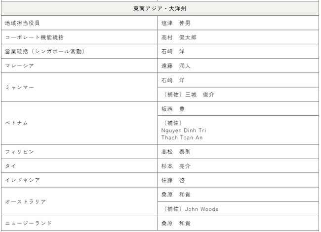 当社グループは、各地域に張り巡らされたネットワークを強みに、時代に応じたお客様の新たなニーズに的確に対応します。尚、2023年4月1日以降のコーポレート機能統括、営業統括、国・地域代表、国・地域代表補佐の体制を以下に記載します。今後も順次各地域における営業体制を強化していきます。