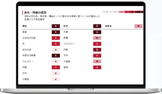 住所・建物構造・築年数を入力することで、構造や雨漏りなどに関する劣化リスクを推定
