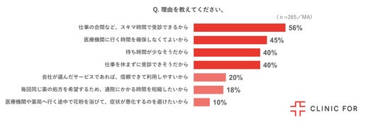 さらに、その理由を調査したところ、「仕事の合間など、スキマ時間で受診できるから(56%)」「医療機関に行く時間を確保しなくてよいから(45%)」「待ち時間が少なそうだから(40%)」「仕事を休まずに受診できそうだから(40%)」と時間的負担の軽減が上位を占めました。