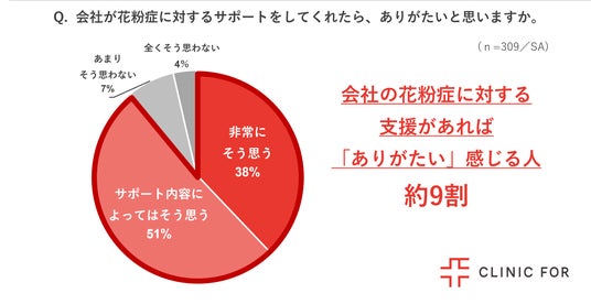 働く花粉症の人309名に、会社が花粉症に対する支援をした場合どのように感じるか調査したところ、89%が「ありがたいと思う」と回答しました。