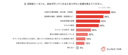 また、勤務先での支援があると回答した175名に具体的に行われている支援について調査したところ、最多が「マスクの配布(45%)」となりました。次いで「空気清浄機の設置(36%)」、「医療費の補助(通院費・診察費など)(34%)」、「お薬の費用補助(処方薬・市販薬)(31%)」となりました。実際に行われる職場での花粉症に対する支援は、マスク配布が最多であることがわかりました。