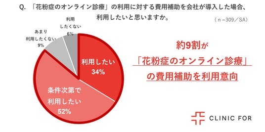 「花粉症のオンライン診療」(※)の利用に対する費用補助を会社が導入した場合、利用したいと思うか調査しました。その結果、利用したいと回答した人は約9割にのぼりました。